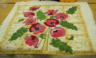 Wendy amazed us all, again... last week she spoke about poppies... then last Wednesday we saw her making, what we thought was, an Hour Glass block quilt using various cream fabrics. Saturday she was cutting out pink and green bits... Wednesday morning she brought in this... Oh My! it is beautiful... The green fabric was the right shade but to add a little extra texture... Wendy painted it... Just like that!! I feel a breathless moment coming on again...