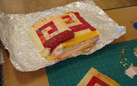 Lizi continued making border blocks for her huge quilt. It's a pattern in the Judy Martin Log Cabin book and incorporates millions of blocks, well it must feel like millions to Lizi. She pins and sews very precisely, every block turns out pretty much perfect, no prrressing or ironing to distort things, finger pressing is quite sufficient.