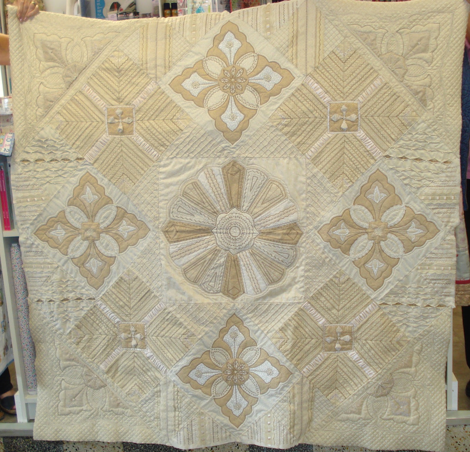 Ta daaaa... Maid Marion has the centre of her Heirloom Quilt finished... she is really happy with how it turned out. I think we are all impressed with the way the two ladies have worked relentlessly on all the blocks and stitching... it's lovely to see the quilts taking shape now... There is still a lot of stitching to be done for the borders, I think they're about 18" deep... the poor sewing machines will need to be treated to a good and thorough service after all the work they have had to do.