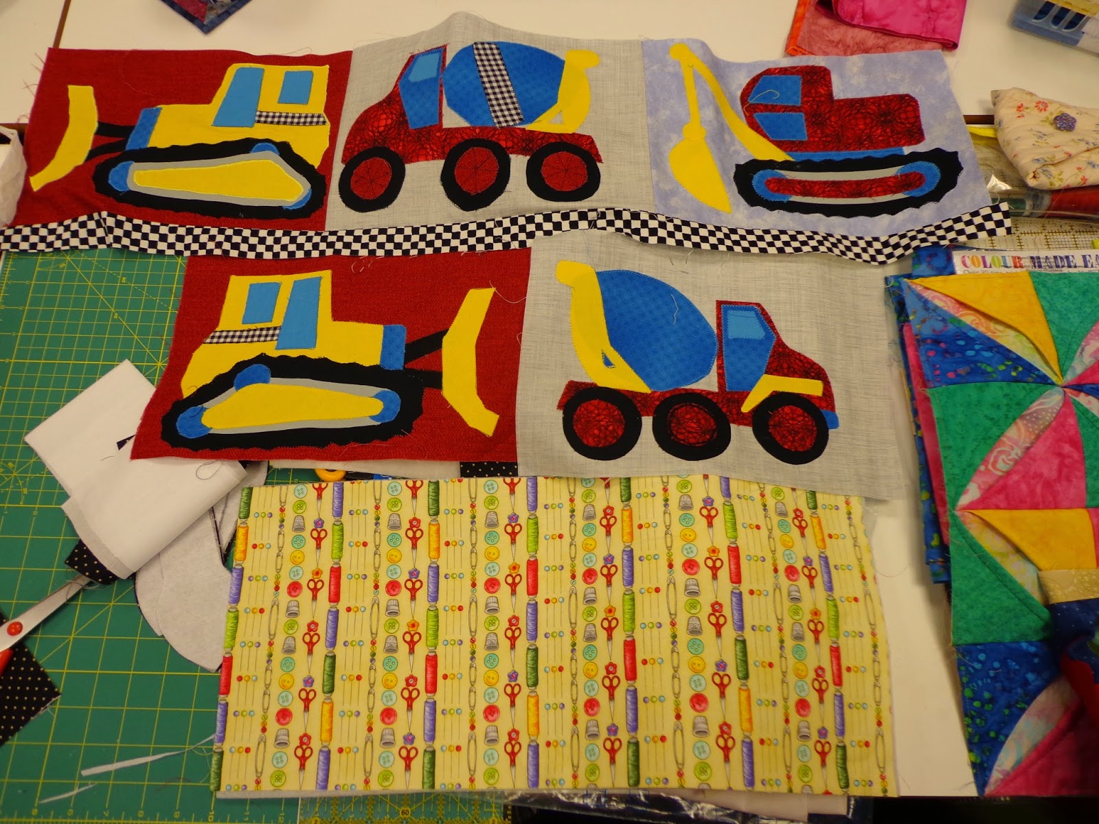 | Jeannette Dilly kept up the pace from last week's class... she made more of the appliqué blocks for her Poppa's Digger quilt and, of course, she was working on something else as well.... the piece you see there is part of a bag, a rather lovely bag it will be too. |