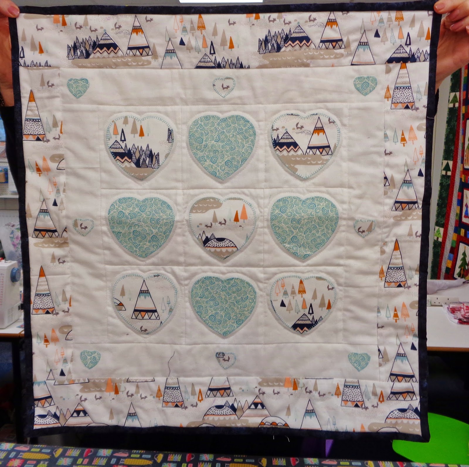 | Giggly Gillian continued with her lovely Teddy Quilt. She played with her stitches and decided to use a blanket stitch for her edges... we love 'sticky stuff' applique! Gillian is going to change thread colours as necessary, which always looks great. |