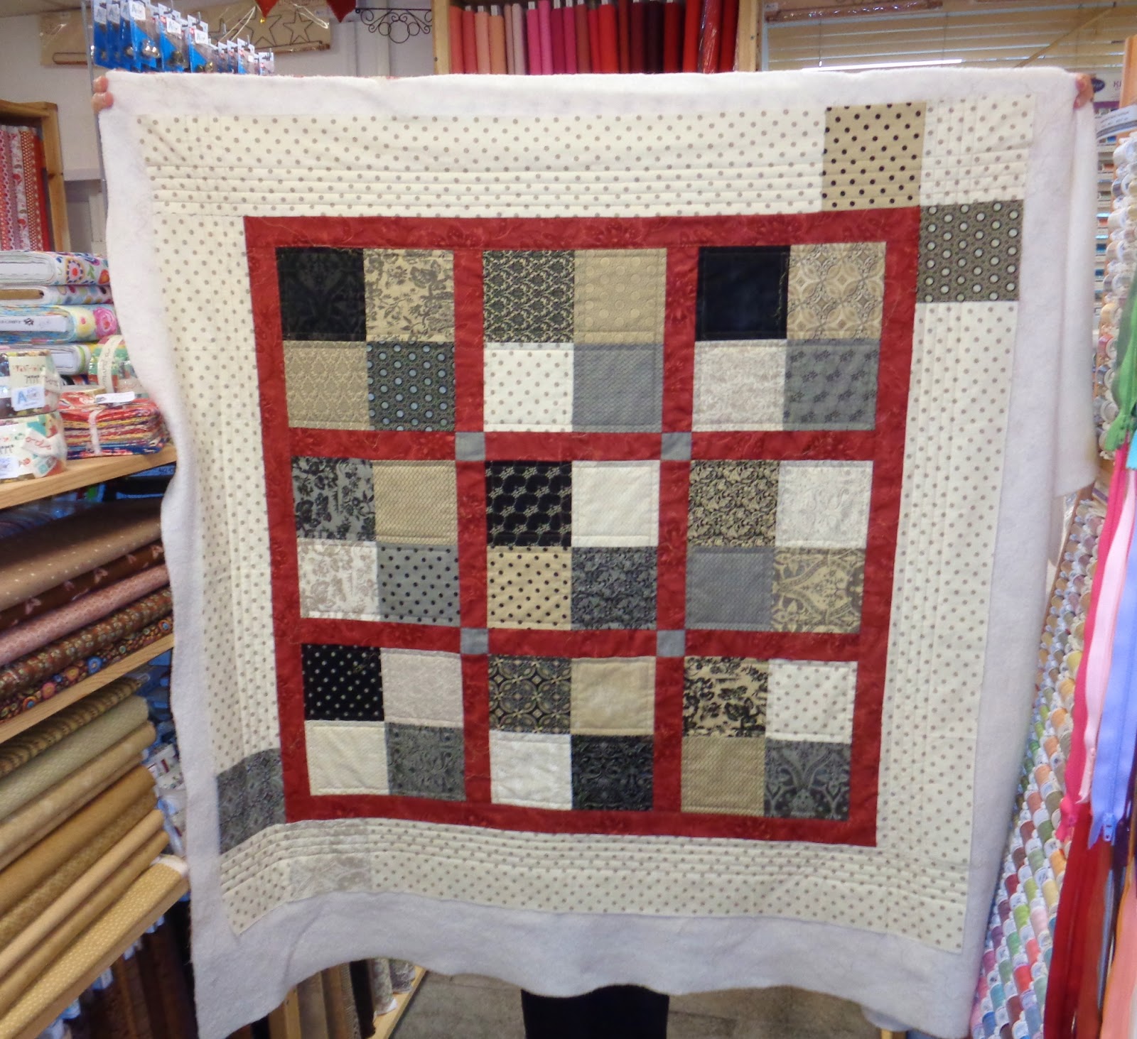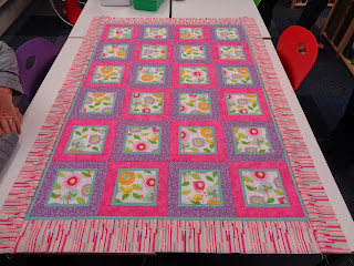 | Brenda Barbara spent her day quilting. She got it all finished and now there's just crusts to trim The binding fabric has been auditioned too, ready for next time. |
