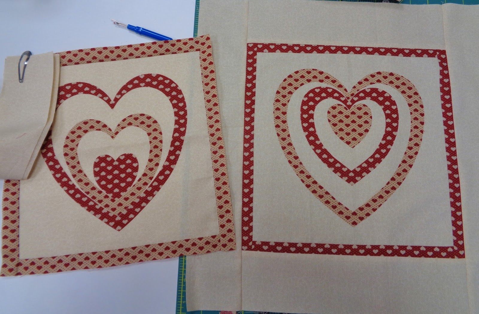 | All Day Di Finished her two cushions... Applique hearts made exactly the same way but... they look completely different don't they. Toot toot toot Di... fabulous and finished |
