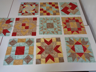 | Gail has been having fun making these sampler blocks. 10 done and two more to go. Gail's using a Jelly Roll book pattern but cutting her very own 2 1/2" strips What beautiful fabric choices!!! |