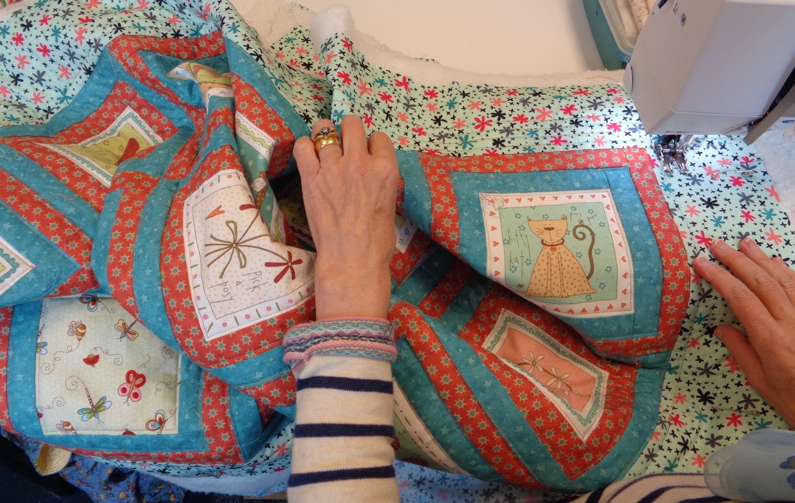 | Loulou couldn't be happier with her quilt... it's also been made for gifting, and what a treasure it is! Fussily cut border fabric frames the Kid's Quilts Owlie quilt pattern brilliantly, making it a great size... it was sandwiched and quilting was started. |