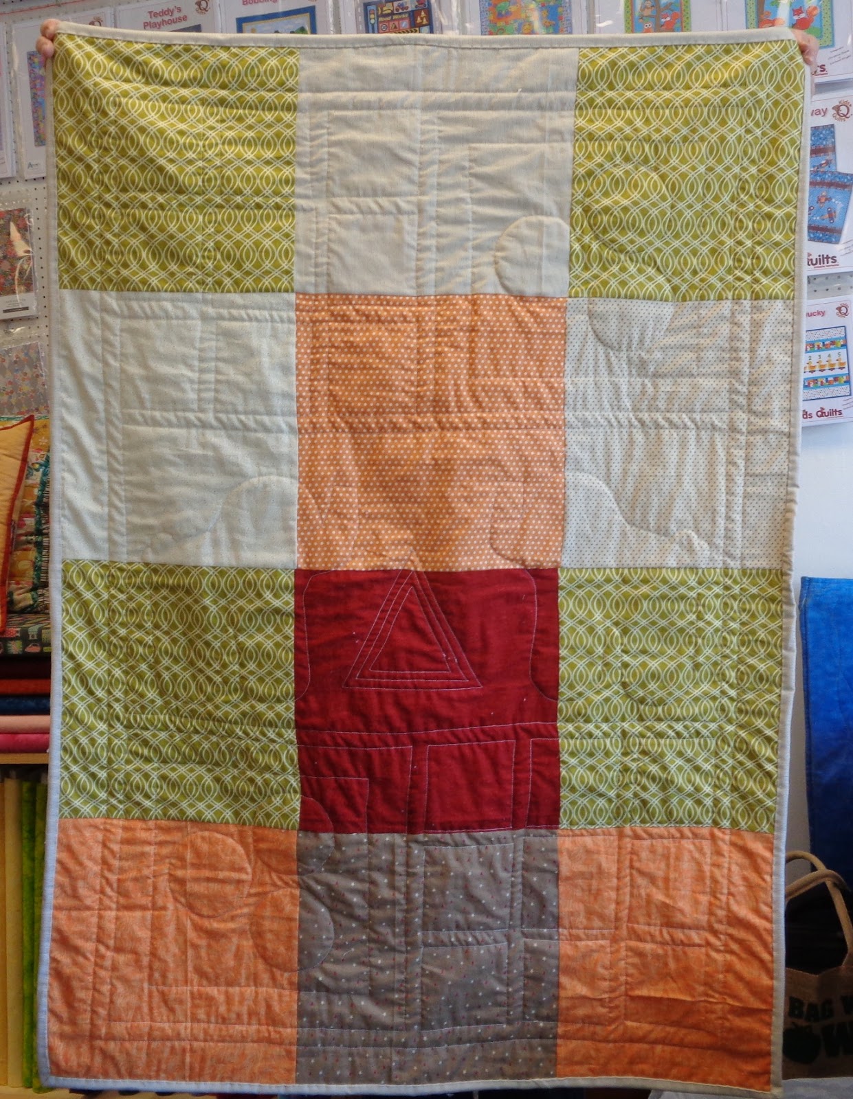 | Our Peggy finished another little quilt/play mat... She loves making them, though she's never quite sure what she will do with each one until it's completed. Many have been donated to the Donna Louise Hospice. This particular "Eye Spy" playmat will go to Linus. Toot toot toot Peggy, your quilt is just fabulous. |