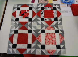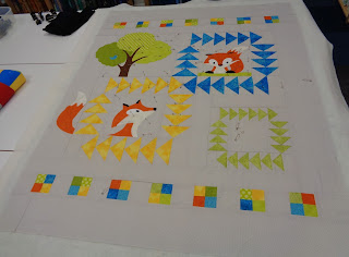 | Princess Jackie's quilt is looking extremely cute. When she held it up, the" Oooh's" and "Awww's" must have been heard over many miles, I'm sure... Made with a wonderfully cute pattern from Oz... it's from here (though I find the website a little tricky, others have succeeded) Of course Jackie's our 1st prize winning applique quilter, so her fabric choices and stitching are what makes it absolutely fabulous. |