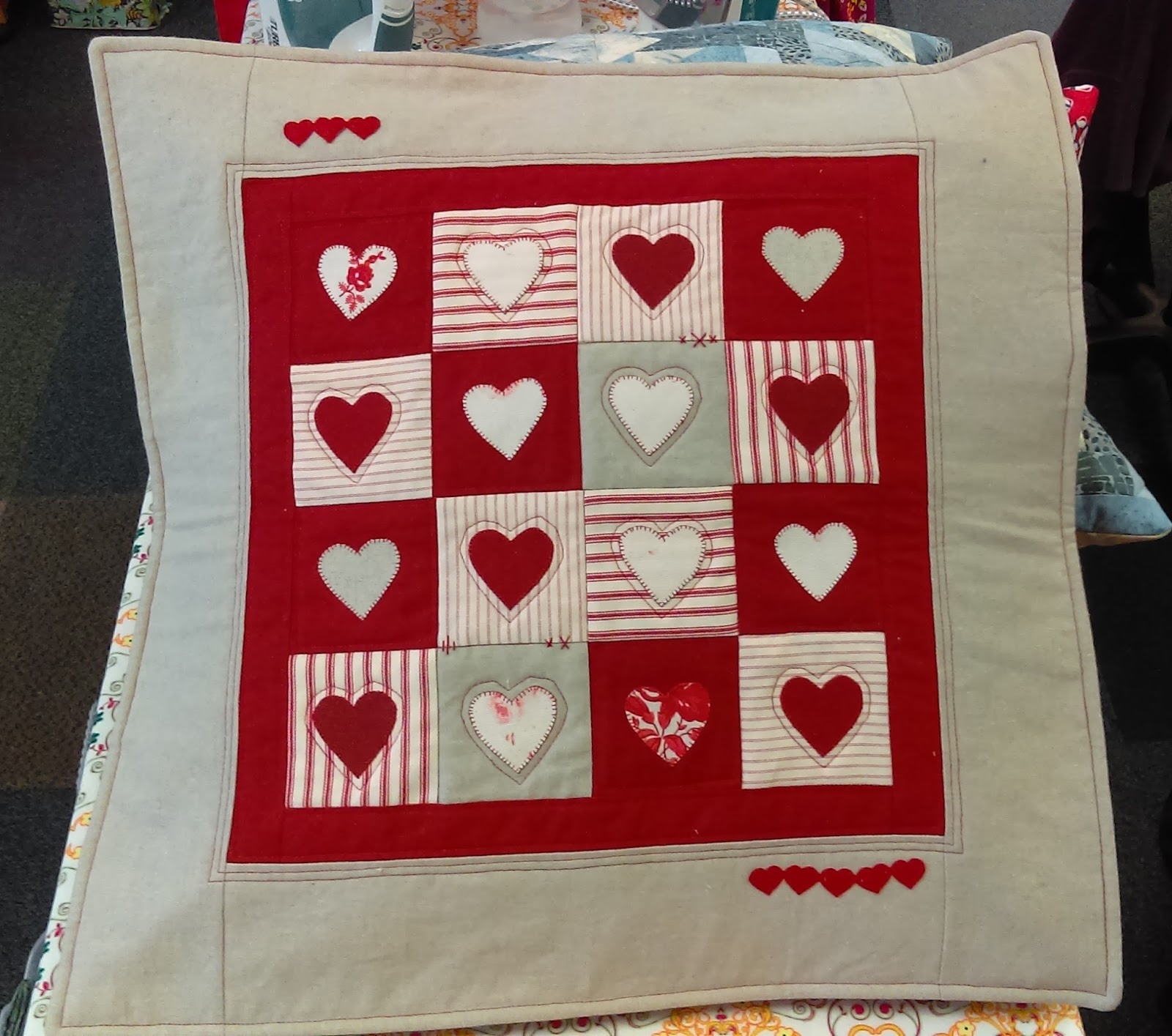 | Those hearts say it all don't they? Two very different cushions made with luscious reds and lovely Linen... Perfect, fabulous and finished... with covered zips on the backs! toot toot toot Rose. |