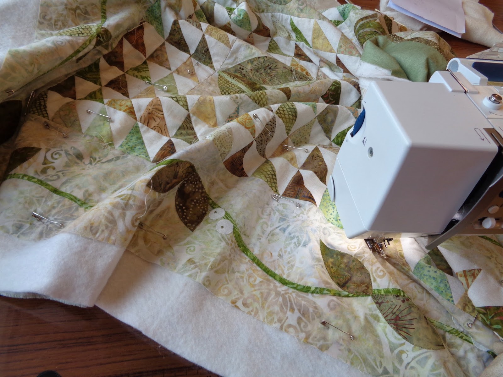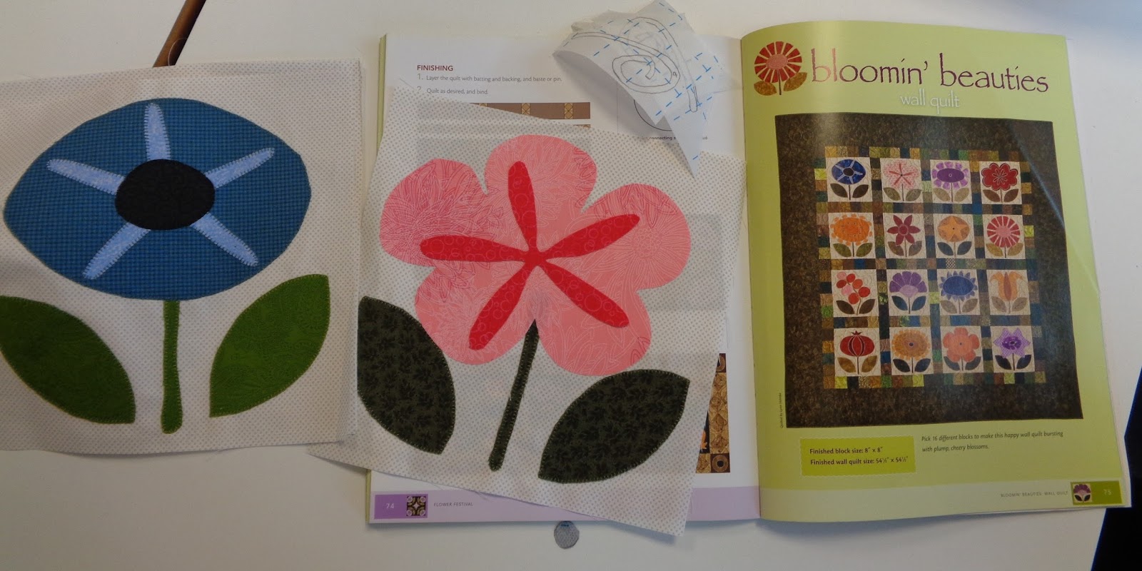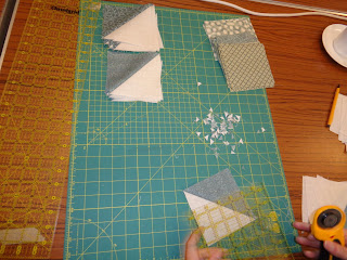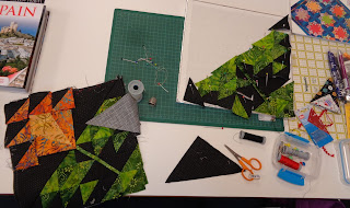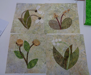 | I told you... Spring-iness is in the air! I posted this pattern on my Facebook page very recently... The Tuesday ladies decided to make it as a group project but New Sue got all excited and made a speedy start on it... all the Half Square Triangles are made and these appliques are well on the way.... isn't it wonderful to feel so excited about a project! |