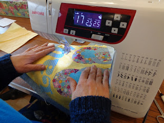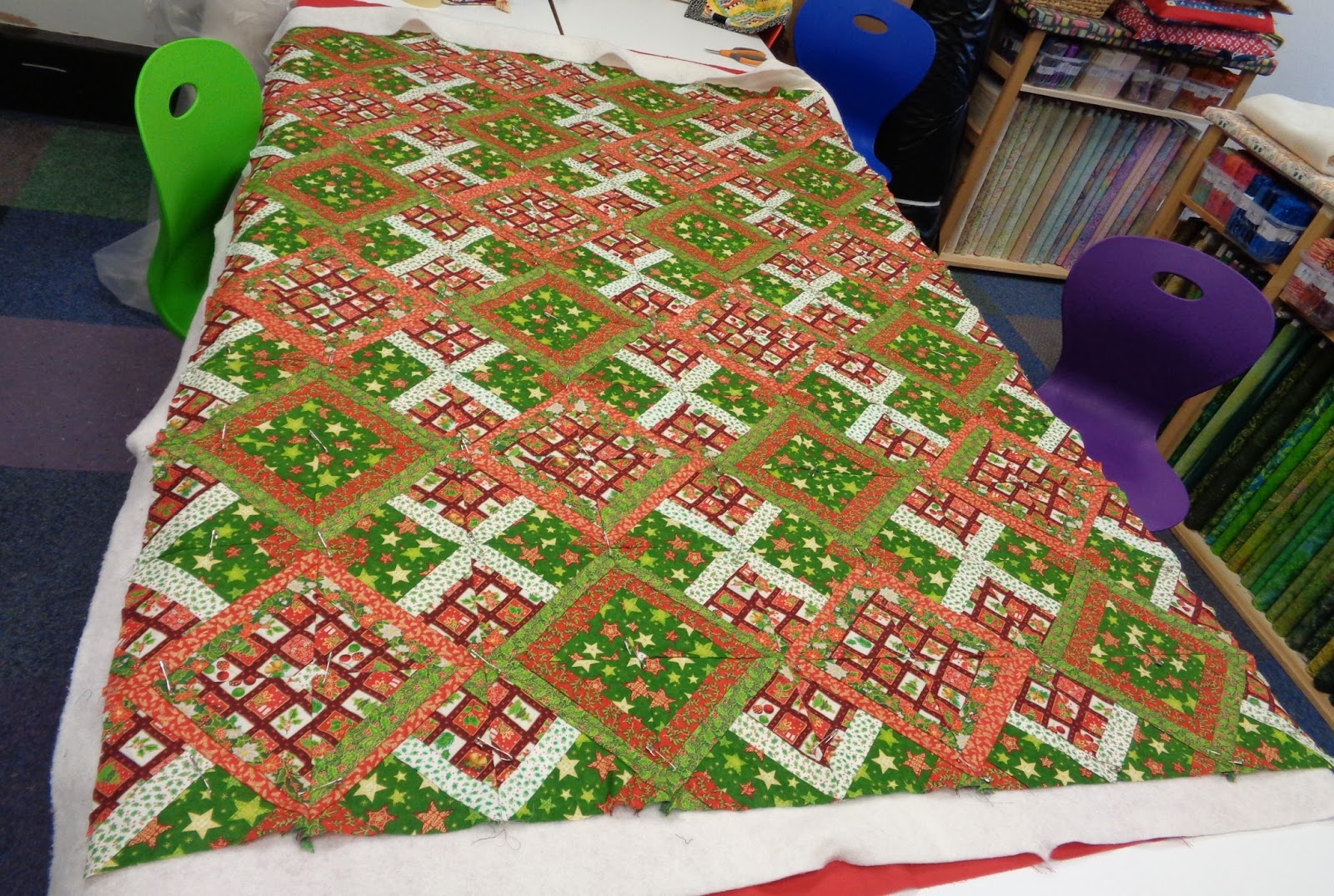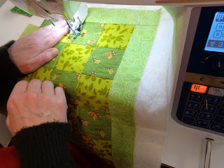 | Brenda Duck had finished stitching her backing together and, as most ladies played safe and chose to stay home while Doris passed through, there was space enough to make a quick sandwich. Brenda is going to quilt with diagonal lines... in my quirky way... I will show you once shes done. |