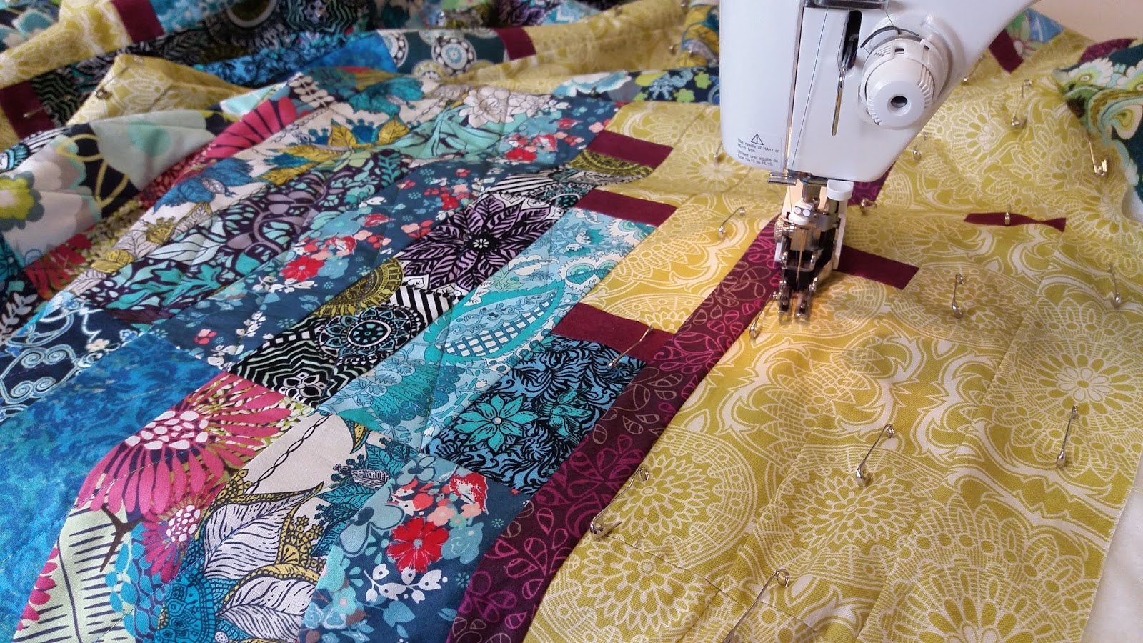 | I forgot to show you this from Saturday Stitching... though technically it wasn't all Saturday sewing as I had started quilting it on Tuesday and managed to do a bit of stitching here and there between customers over the week... but I did finish quilting it on Saturday, while my Lilly was knitting stitches. The binding is on, I did that yesterday, after finishing the large sandwich, and I'm hand stitching it to the back in short bursts. The quilt has been made using one of my new Six Packs |