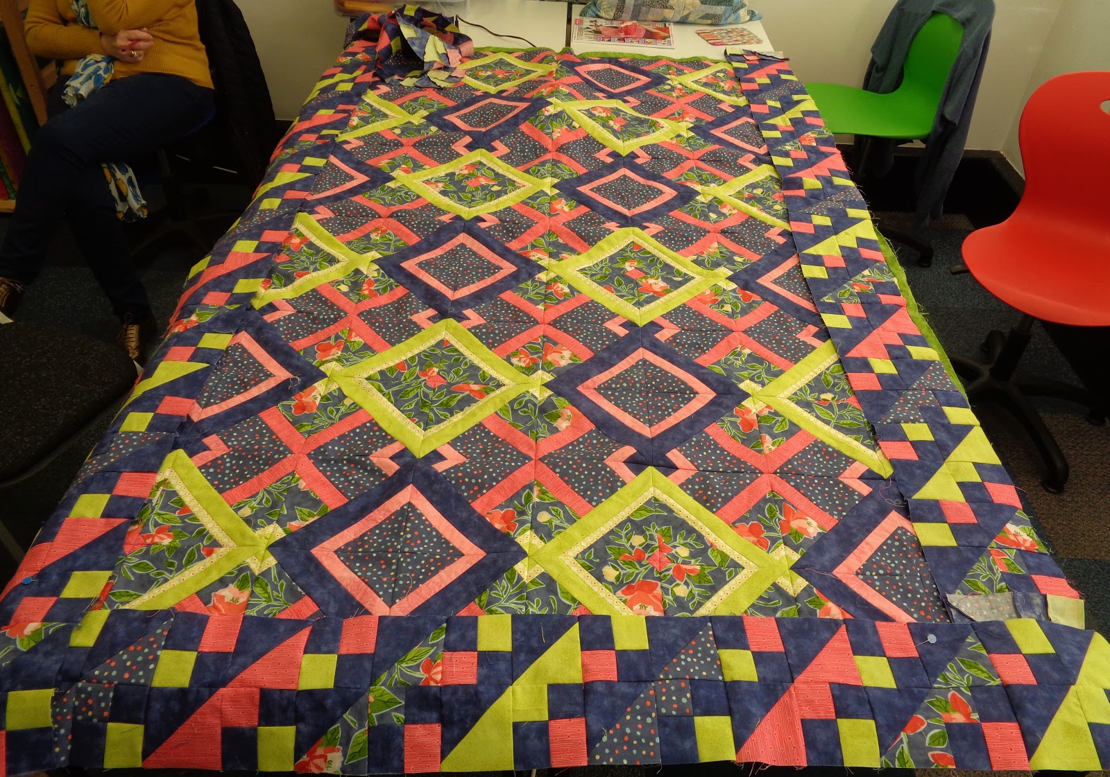 | Our Carol made up this fabulous design and had enough fabric left over to make a great backing too. It's all ready to be sandwiched and quilted. |