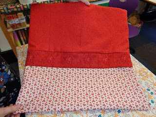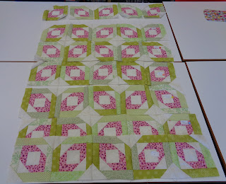| New Sue's sandwich. This also has a great backing. Sue will machine quilt this one. Knowing her is will be finished by next Tuesday's class. |