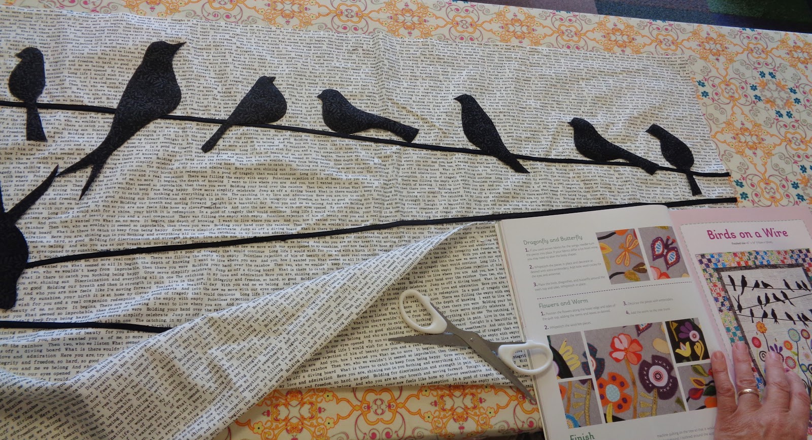 | Farmer Lynda finished her bias strips so she moved on to cutting out all the birds with their quirky little poses. They got stuck on too, ready for a little Blanket Stitch attention. |